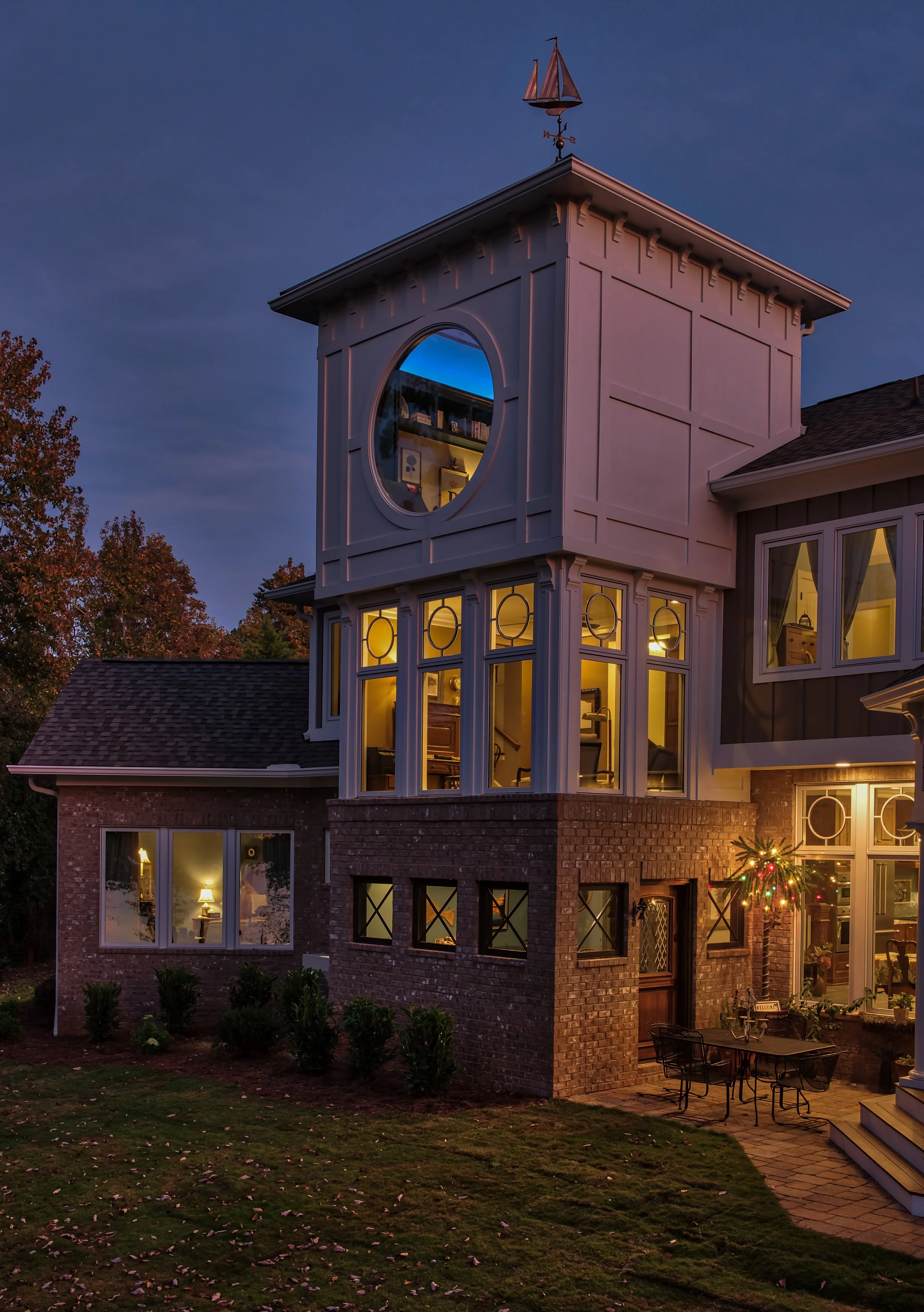 The Lantern emerged as the signature element of the home, highlighted by a striking seven-foot circular window that frames where two rivers meet before flowing into Lake Hartwell. This powerful architectural moment anchors the design while framing expansive views of water, light, and horizon.