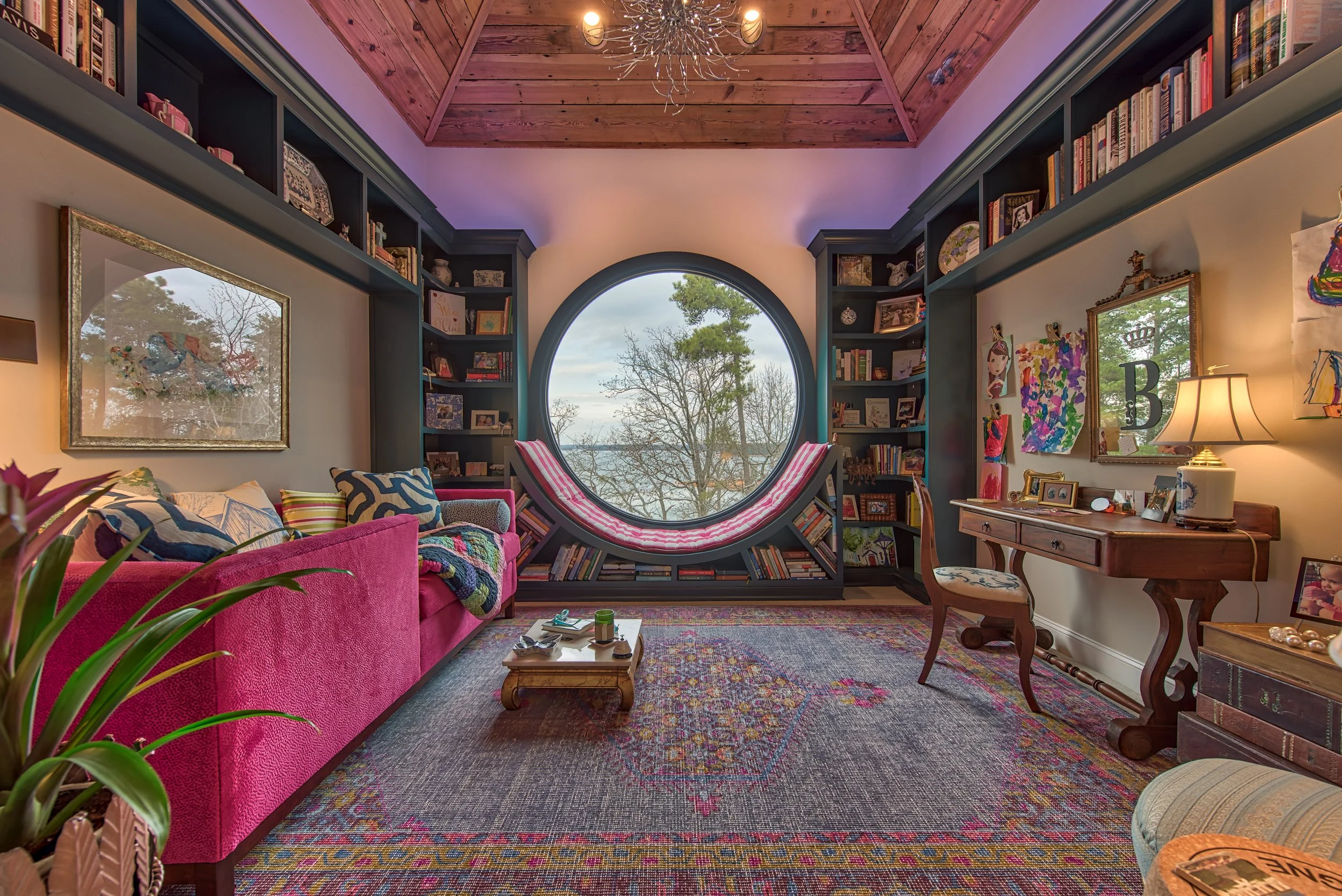 The third level transforms into a private library, complete with wraparound bookshelves and a custom upholstered reading lounger set beside a seven-foot circular window.